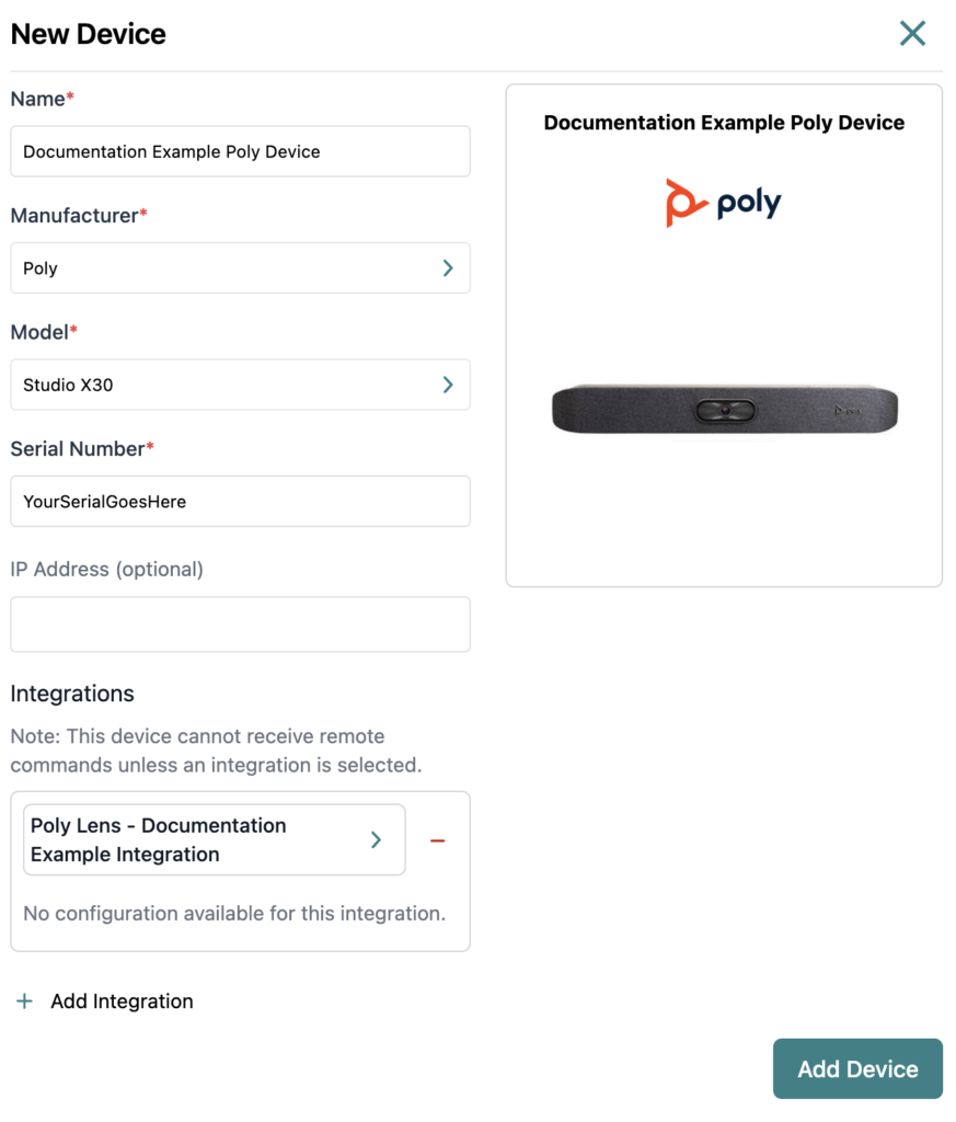 For rooms with multiple pieces of Poly hardware, the device and Serial Number exported from Poly Lens will need to be added individually to NetSpeek for each hardware item. For example, this means that an appliance such as an X30 must be added and saved, then a new device must be added to the NetSpeek Room Canvas for its controller such as a TC8.