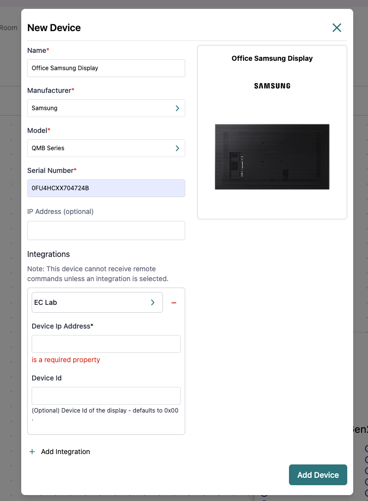 • Device IP Address (required) — the display’s current IP.