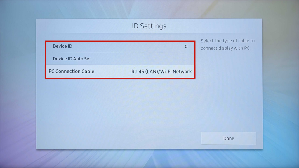 Remote Management / MDC – the names of these features may vary somewhat by device type. Ensure remote control is permitted, assign a Device ID (these must be in the numerical range from 0–253 – for reasons explained below, NetSpeek suggests configuring all Device ID values to be 0), and confirm network cabling. (Onscreen UI navigation may vary by model; look under Advanced Settings → Remote Management or similar.) The MDC ID range and configuration requirements come from the protocol specification.