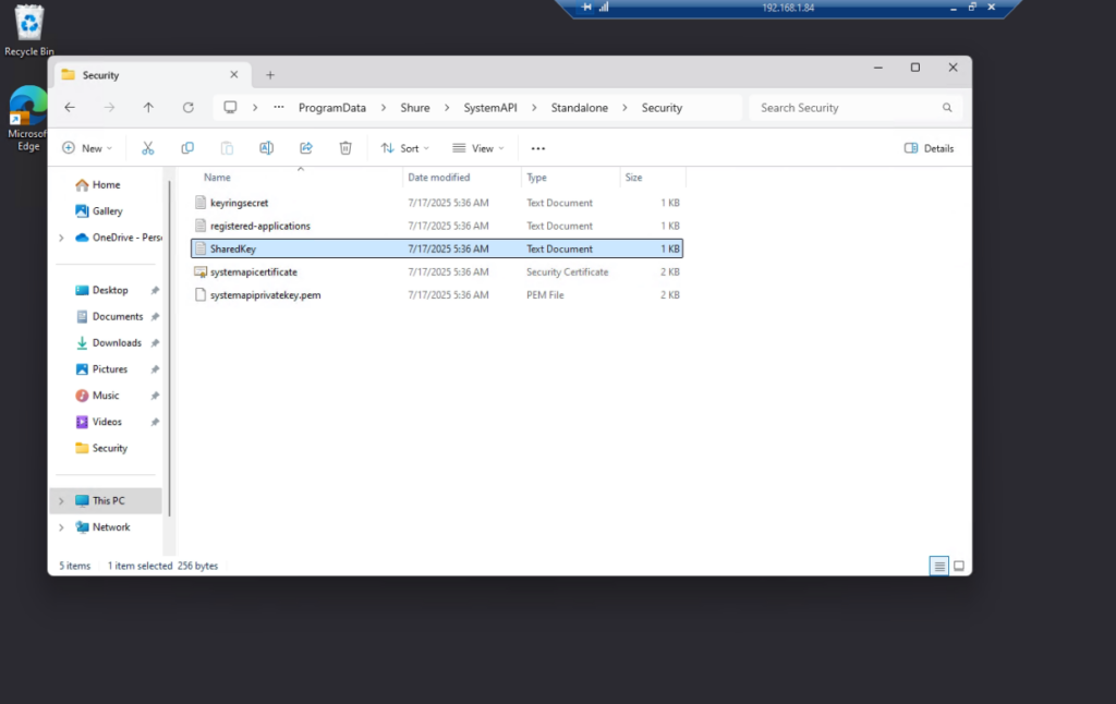- The shared key is an API key which is generated by Shure’s software when System API runs for the first time. This key is found at C:\ProgramData\Shure\SystemAPI\Standalone\Security\sharedkey.txt on the device when accessing via Remote Desktop Protocol or other methods.