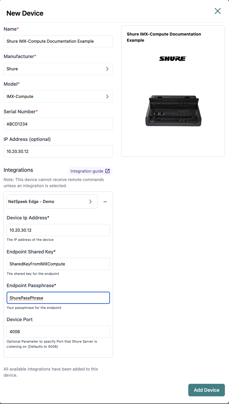 - Once added, NetSpeek will now be able to perform operations on your Shure Intellimix-Compute device.