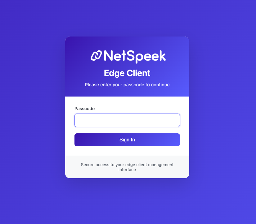Using the IP address above, navigate to NetSpeek Edge Service Management login, input your predefined passcode and Sign In to access the web interface.