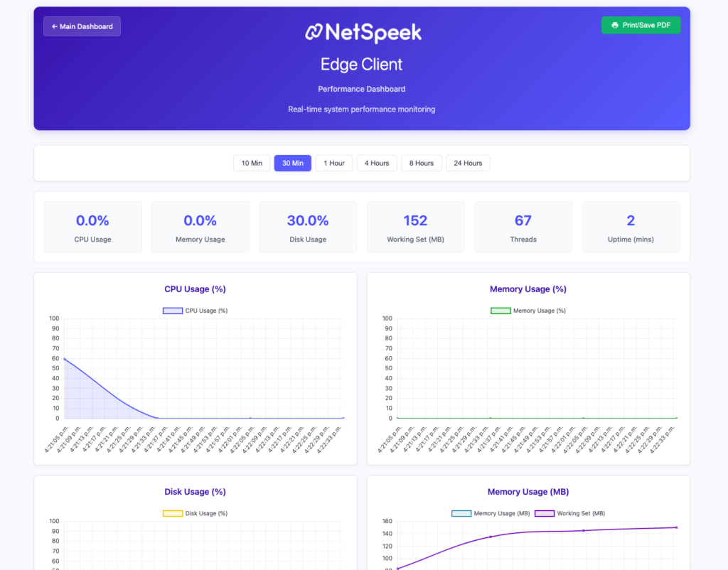 The Performance Dashboard provides incremental visibility into NetSpeek Edge’s resource utilization, including CPU, memory, and disk usage, along with other key performance metrics. You can adjust the reporting window to view metrics over different intervals, such as 10 minutes, 30 minutes, 1 hour, allowing you to monitor system health and ensure the client is running optimally.
