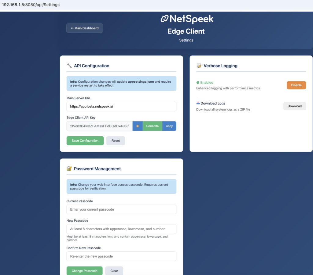 The Settings Dashboard allows you to manage configuration options for NetSpeek Edge. From this view, you can update API settings, adjust password management controls, and enable or disable verbose logging as needed.