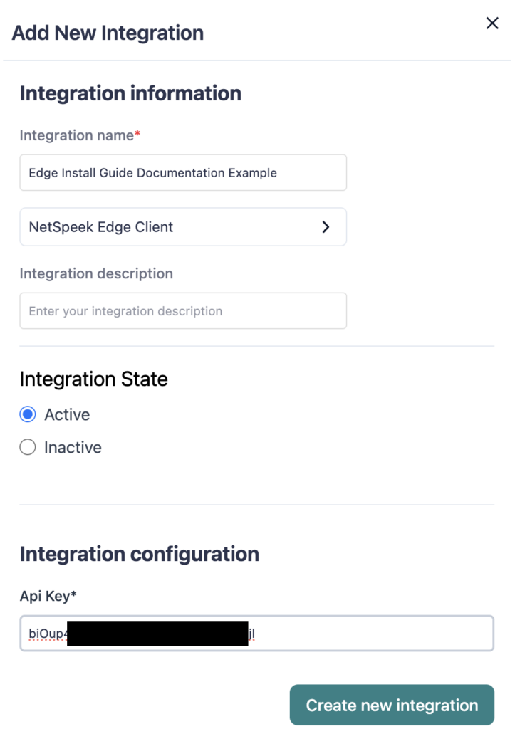 Create a NetSpeek Edge integration in the NetSpeek platform (under your tenant’s integrations list), paste the API key from step 6.1 into the interface as shown below, and click “Create New Integration“.