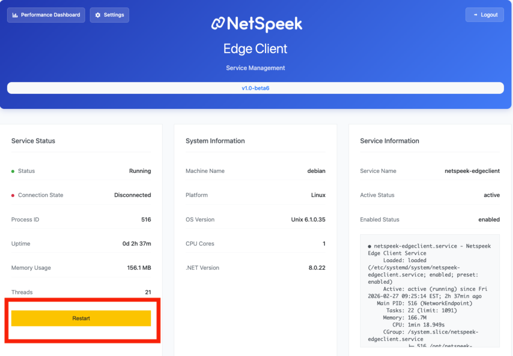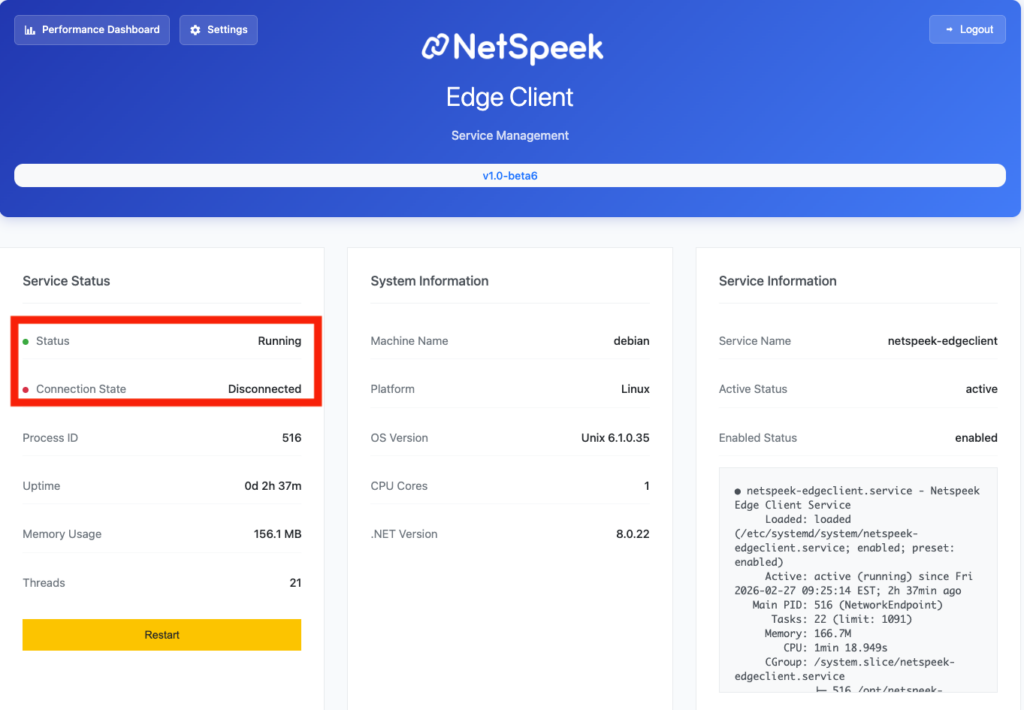 After the above steps are done (API Key created and saved on the Edge, API Key pasted and saved in the web portal), restart the Edge’s services (from the main dashboard’s restart button highlighted below) and verify Connection State changes to Connected (this may take a few moments to change, as the Edge needs to verify connectivity to the NetSpeek platform before changing the status).