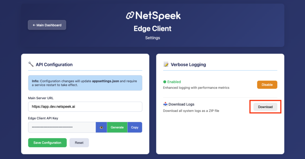 Log Retrieval via the NetSpeek Edge Client Web UI