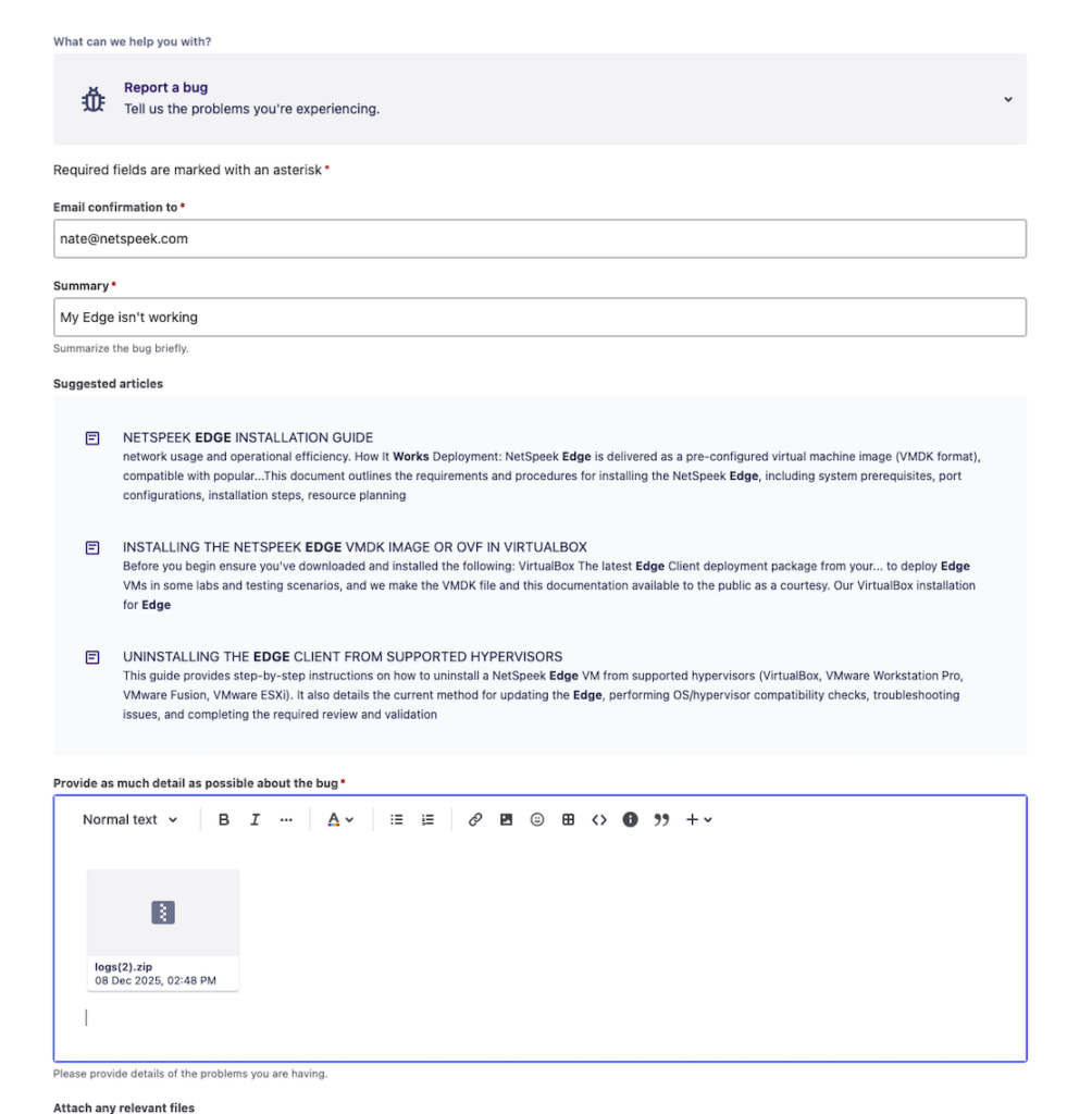 - Attach the log file downloaded from your Edge in Step 3.