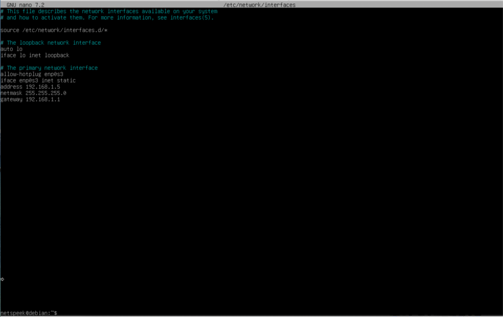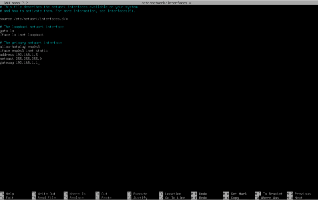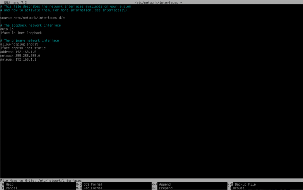 CTRL + X has been pressed, removing you nano and returning to the command line (see lower left of the image)3. Restart Networking Service and Verify the New Static IP