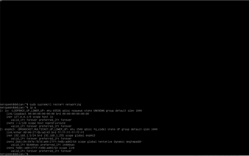 The image below shows an example of the commands described here – restarting the VM’s networking to apply the changes made in prior steps, and verifying the configuration is correct based on the output of the ip a command.